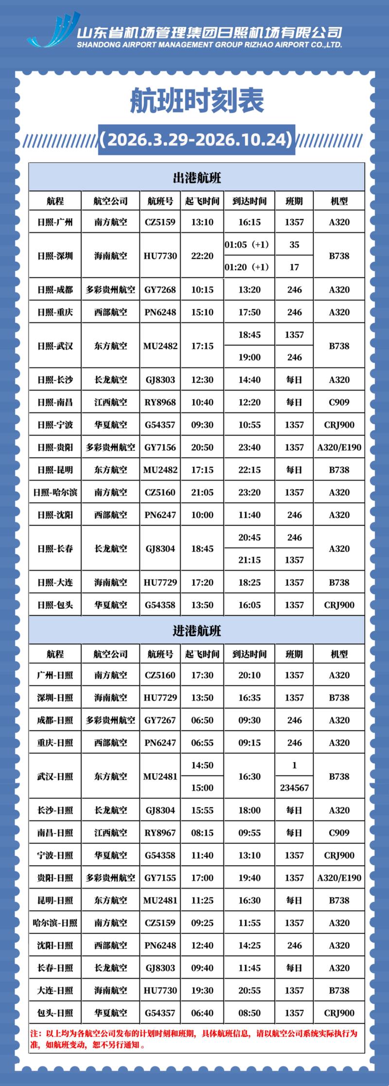 3月29日起,民航夏航季正式开启,日照机场将开通长沙、贵阳、宁波、长春、包头等航线。