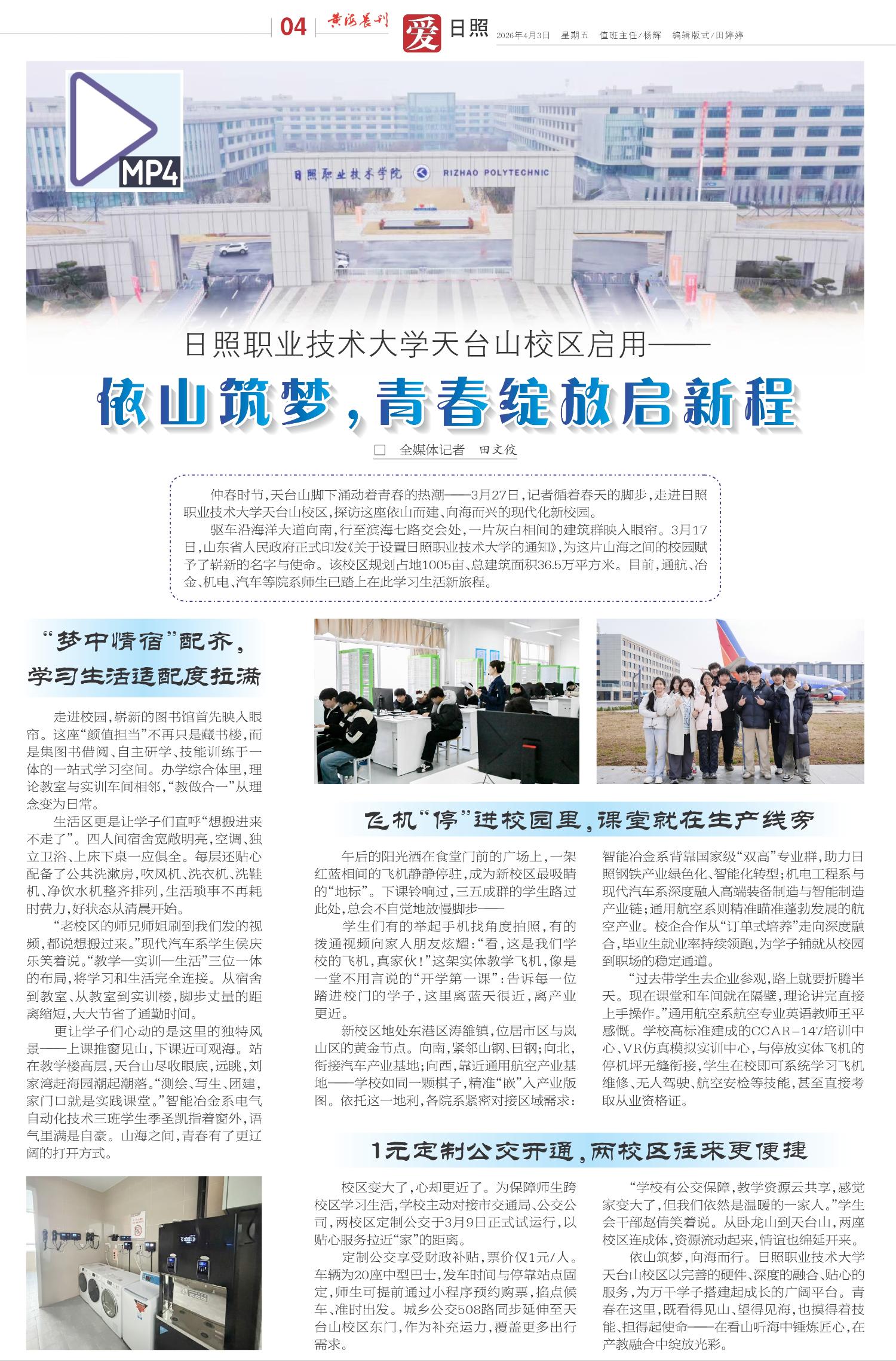 依山筑梦,向海而行。日照职业技术大学天台山校区以完善的硬件、深度的融合、贴心的服务,为万千学子搭建起成长的广阔平台。青春在这里,既看得见山、望得见海,也摸得着技能、担得起使命——在看山听海中锤炼匠心,在产教融合中绽放光彩。