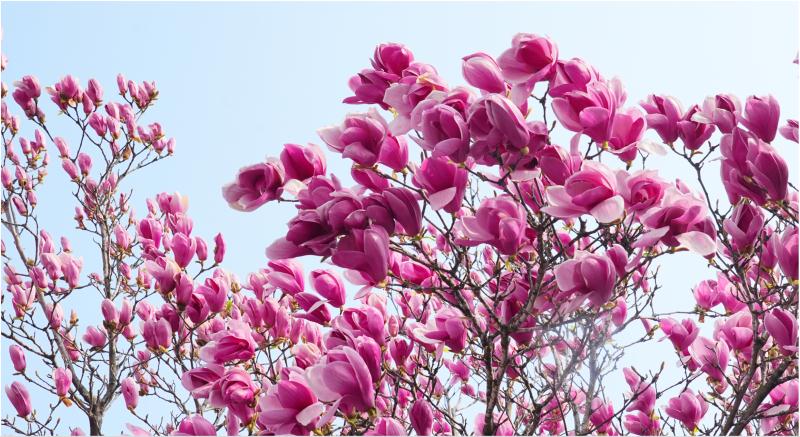 “快看,这个角度正好,把花和蓝天都框进去!”4月2日下午,来自江苏的游客张璇正坐在廊架的木质平台上,她举起手机,对着头顶那枝伸向蓝天的紫玉兰按下了快门。